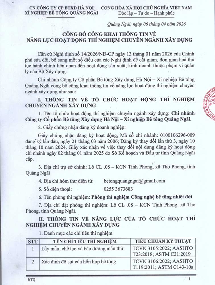 Chi nhánh Công ty Cổ phần Bê tông Xây dựng Hà Nội - Xí nghiệp Bê tông Quảng Ngãi: "CÔNG BỐ CÔNG KHAI THÔNG TIN VỀ NĂNG LỰC HOẠT ĐỘNG THÍ NGHIỆM NGÀNH XÂY DỰNG".